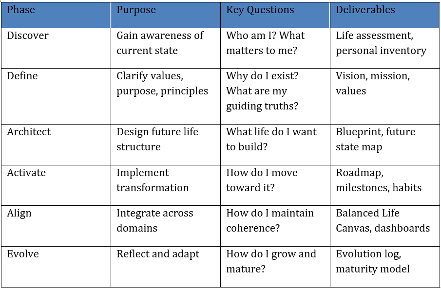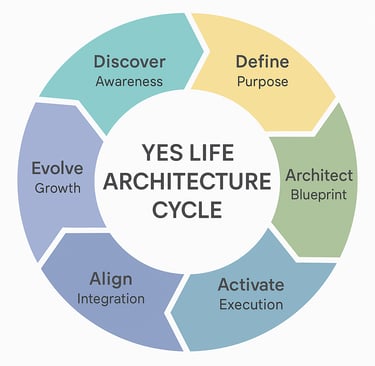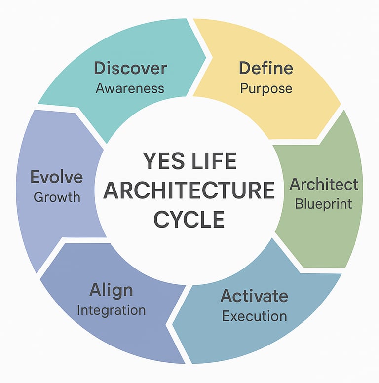The six-phase Life Architecture Cycle reflects the continuous evolution of life: Discover, Define, Architect, Activate, Align, and Evolve. Each phase transforms awareness into action and growth.