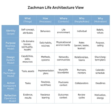 This table applies Zachman’s 5W1H interrogatives across human life perspectives to build systemic understanding.